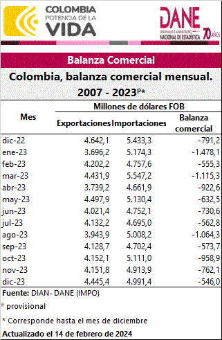El déficit de la balanza comercial tuvo contracción del 30%, en el 2022 fue de USD$14331 millones y en total 2023 de USD$9902 millones. Las exportaciones de USD$57115 millones a USD$49543 millones, 10,3%. Las importaciones de USD$71446 millones a USD$59445 millones, se dejaron de exportar el 16,7%. El déficit de la balanza comercial en diciembre fue USD$546 millones, en el mismo mes 2022 USD$791 millones, se redujo con el 30,9%. – Se interpreta que la reducción del comercio internacional, es porque la Tasa representativa del mercado en el transcurso del año disminuyó con pasar aproximadamente de $4900 a $3900, lo cual redujo el valor tanto de lo exportado e importado-.