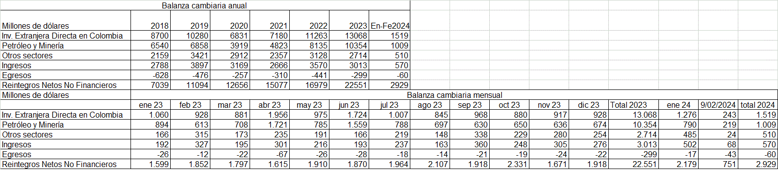 El total que suma la inversión extrajera es USD$13068 millones, USD$1805 millones más que 2022, USD$2789 millones que 2018 y USD$ 4369 millones más que 2019. En el mes de abril 2023 fue cuando más recibió con USD$1956 millones. En este año, los reintegros netos no financieros sumaron USD$22551 millones y el mes octubre con USD$2331 millones: en su conjunto comprenden las divisas por turismo, servicios portuarios, seguros y reaseguros, marcas, patentes y regalías, servicios técnicos, servicios de transporte por tubería de petróleo y gas natural, gastos de permanencia de viajeros de negocios, gastos médicos y educativos, seguridad social, suscripciones y afiliaciones, arrendamiento operativo, publicidad comercial, servicios culturales, artísticos y deportivos, pasajes, servicios de comunicaciones, comisiones no financieras, servicios diplomáticos, consulares y otros conceptos.