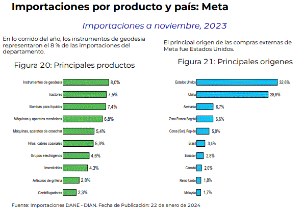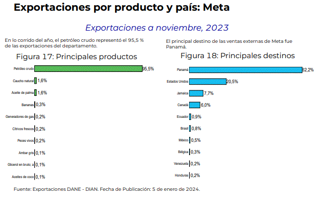 El departamento Meta participa del total de exportaciones a nivel nacional con el 1,16% en el 2023 hasta noviembre. En este mes y en lo acumulado del año, se exportaron USD$522 millones 236 mil. Las minero energéticas USD$498 millones. Las agroindustriales USD$9 millones 279. Industria básica USD$9 millones. Agropecuarias USD$ 3 millones 945 mil. Maquinaria y equipo USD$1 millón 145 mil. Industria liviana USD$234 mil. Industria automotriz USD$10 mil. Demás productos USD$19 mil.