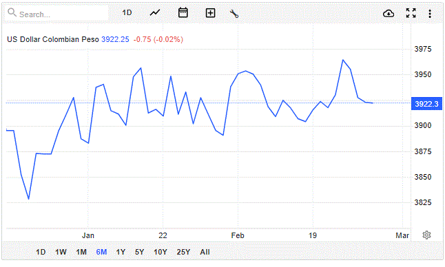 El miércoles 28 febrero, la Superintendencia financiera de Colombia, la Tasa representativa del mercado fue de $3933. El viernes 23 USD$3960, el máximo valor alcanzado desde el 26 de enero, y el mínimo de $3880 el día primero del segundo mes de 2024.