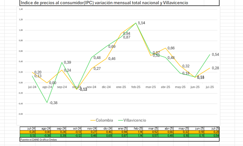 En julio de 2024, los precios promedio y en general variaron con el 0,20% y en el 2025 durante el mes 0,28%, la diferencia más el 0,08%. En el Villavicencio de 0,13% a 0,54% comparativamente más el 0,41%