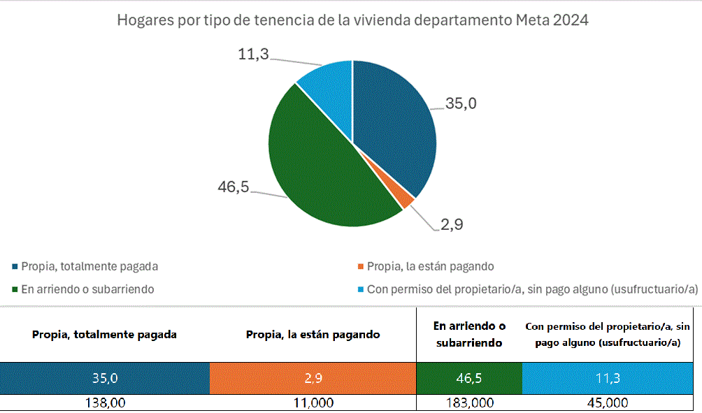 En el departamento Meta, la encuesta de Calidad de Vida, el total de hogares son 395.000 aproximadamente. Viven en viviendas completamente pagadas 138.000, el 35%. La están pagado 11.000, el 2,9%. En arriendo 183.000, el 46,5%. Sin pago alguno 45.000, el 11,3%.