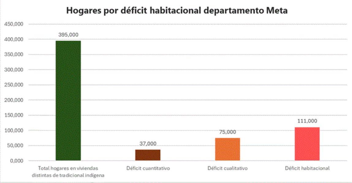 En el territorio Meta, el déficit habitacional es de 111 mil, el 28,2% del total de los hogares en el Departamento, el déficit cuantitativo 37 mil, el 9,3%, y cualitativo 75 mil, el 18,9%.