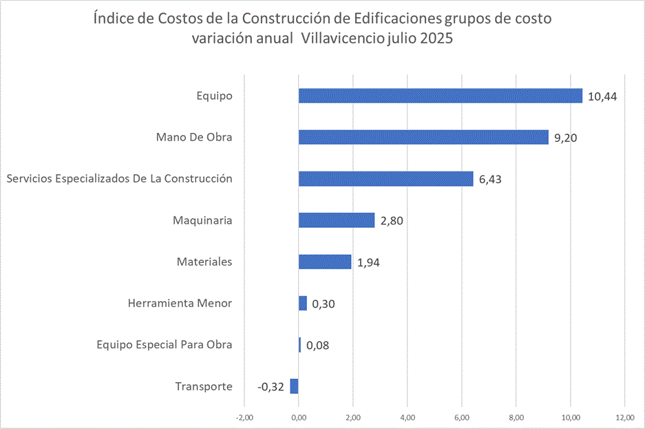 En julio, la variación anual de los costos. Los equipos utilizados en la construcción aumentaron 10,44%. Mano de obra 9,20%. Servicios especializados 6,43%. La maquinaria 2,80%. Materiales 1,94%. Herramientas menores 0,30%. Equipo especial para obra 0,38%. Transporte bajaron los costos menos -0,32%.