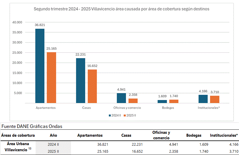 En el segundo trimestre de 2024, el área causada era de 69.768 m2 en los municipios comprendidos, en el 2025 con 49.625 m2 causados, los terrenos en construcción disminuyeron 20.143 m2, con una reducción de 40,6%.