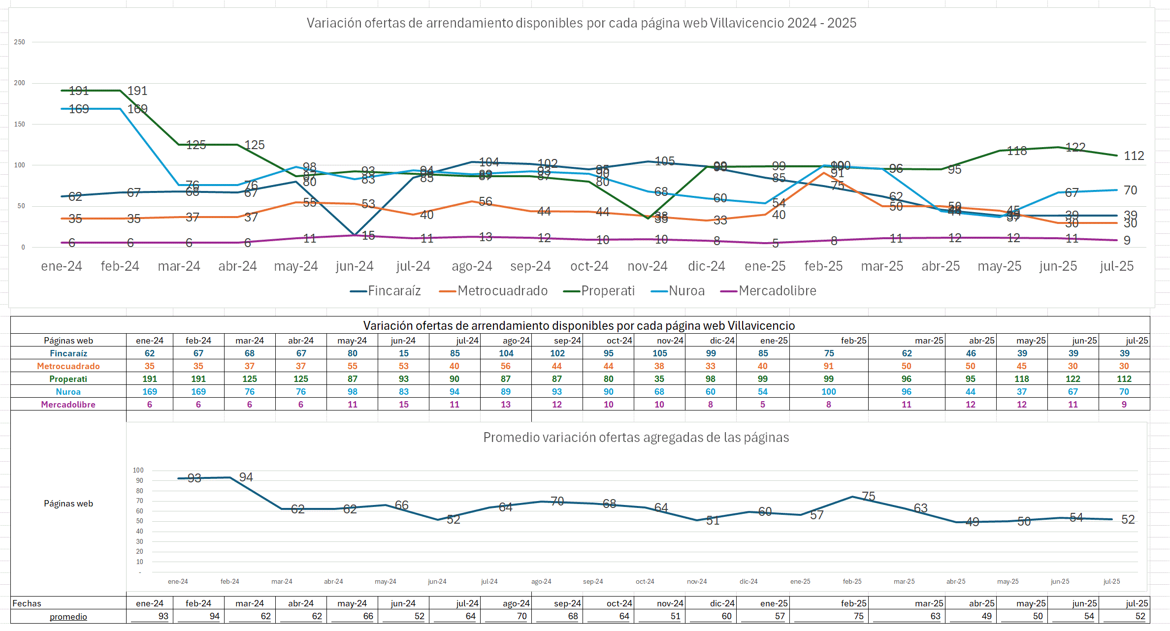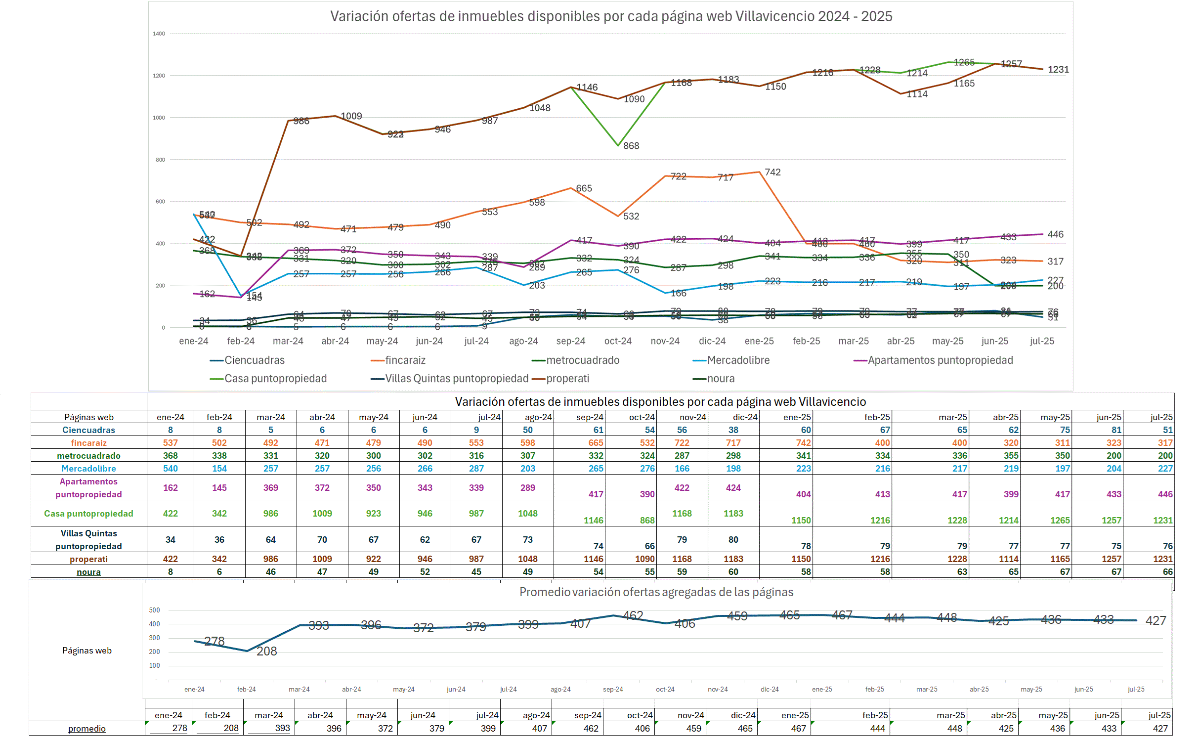 En Villavicencio, las distintas páginas con ofertas de inmuebles, en promedio hay 427 en el mes de julio, el año pasado en el mismo mes eran 399, la diferencia con 28 más. A partir de agosto de 2024 aumentó lo ofertado y están sobre los 400, entre enero y junio 2024 pasaron de 278 a 379.