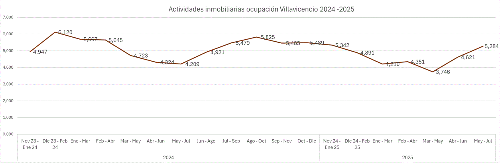 Las inmobiliarias ocupan con 5.284 en el trimestre mayo julio de 2025. El año pasado en el periodo en mención eran 4.209, entonces, la economía de este sector a creado 1.076 ocupados más. En los meses de diciembre 2023 a febrero 2024, la ocupación fue de 6.120, y el máximo de trabajadores dedicados a la actividad inmobiliaria.