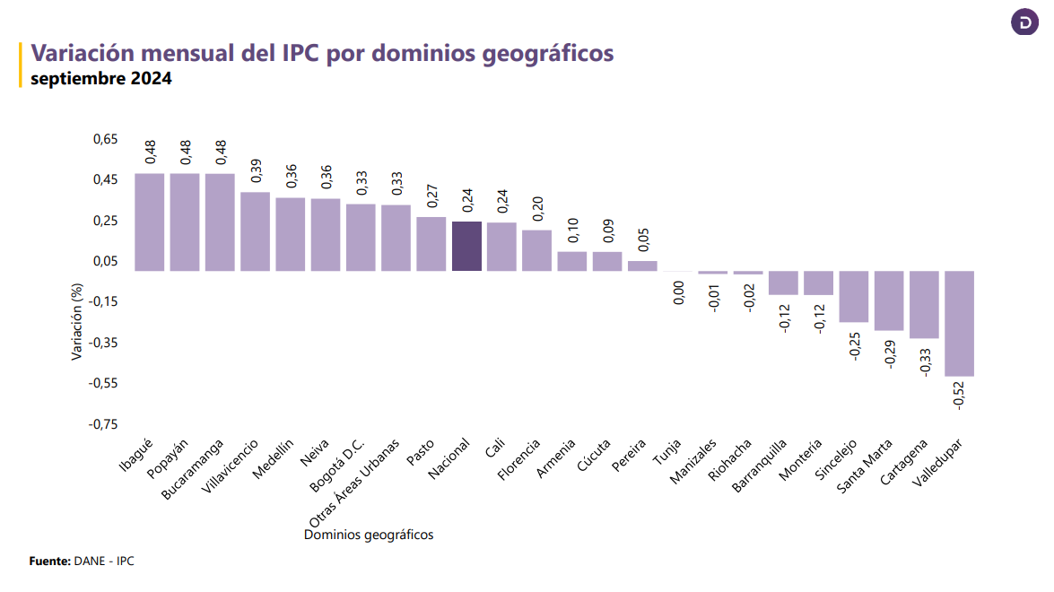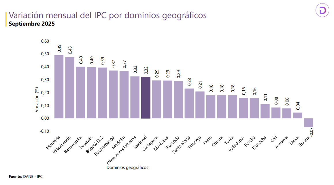 Los precios en el mes variaron al alza a nivel nacional cuando en septiembre de 2024 el registro fue de 0,24% en Colombia y Villavicencio 0,39% con 0,08% y 0,09% cada diferencia. En Bogotá 0,33% el año pasado y 0,39% en el 2025, precios promedio los cuales en el Distrito Capital comparativamente el resultado es más 0,06%.