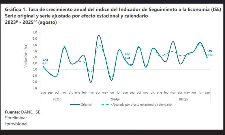 El Centro de Estudios Económicos de la Asociación Nacional de Instituciones Financieras afirma el liderazgo del comercio es por la adquisición de los hogares de bienes entre estos equipos de informática, alimentos y electrodomésticos. El desempeño del transporte aéreo el aumento de pasajeros internacionales. En cuanto a la administración pública, el pago retroactivo a entidades de la rama judicial, notariado y registro, destacan el gasto de la Registraduría Nacional del Estado Civil las elecciones de los Consejos de Juventud. Las artísticas el concierto de la agrupación Green Day de punk rock en Bogotá y la asistencia de 35.000 personas. Las apuestas ‘deportivas’ y juegos en línea continúan con aportar significativamente. El decrecimiento del sector segundario está en la construcción, la falta de inversión en edificaciones residenciales y civiles no compensa el agregado con la industria, la cual en la variación anual de agosto crecía el 0,4%, la fabricación de refinados de petróleo, químicos, además farmacéuticos y plaguicidas.