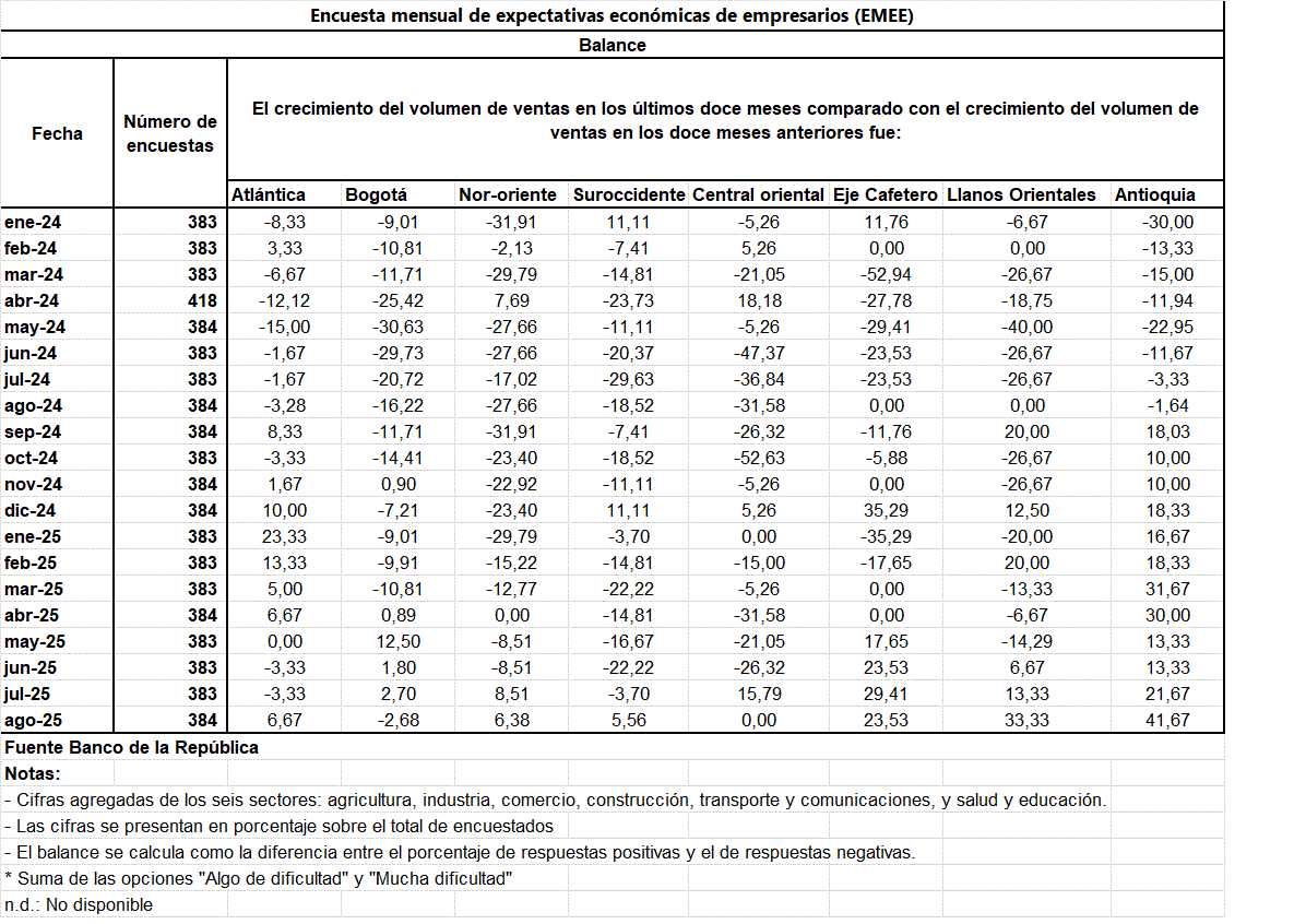 El 33,33% de los empresarios consultados en los Llanos Orientales, responde el volumen de las ventas, creció en agosto de 2025, en el 2024 fue 0,00%, es decir los resultados fueron neutros, no crecieron o disminuyeron en comparación con los doce meses anteriores. Es la segunda región con desempeño positivo significativo, la primera Antioquia con dinámicas comerciales donde 41,67% de los consultados respondió vender más.