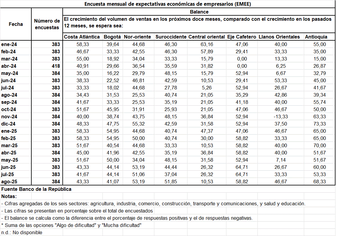 La región más optimista Antioquia donde los consultados el 68,33% de los empresarios espera crecer las ventas. El eje cafetero con 58,82%. Suroccidente 51,85%. Nor Oriente 53,19%. Los llanos Orientales 46,67%, el año pasado en el mismo mes esperaban en los próximos doce meses siguientes vender más 42,86%, el optimismo comparativamente ha mejorado 3,81% entre quienes participan en la encuesta expectativas económicas.