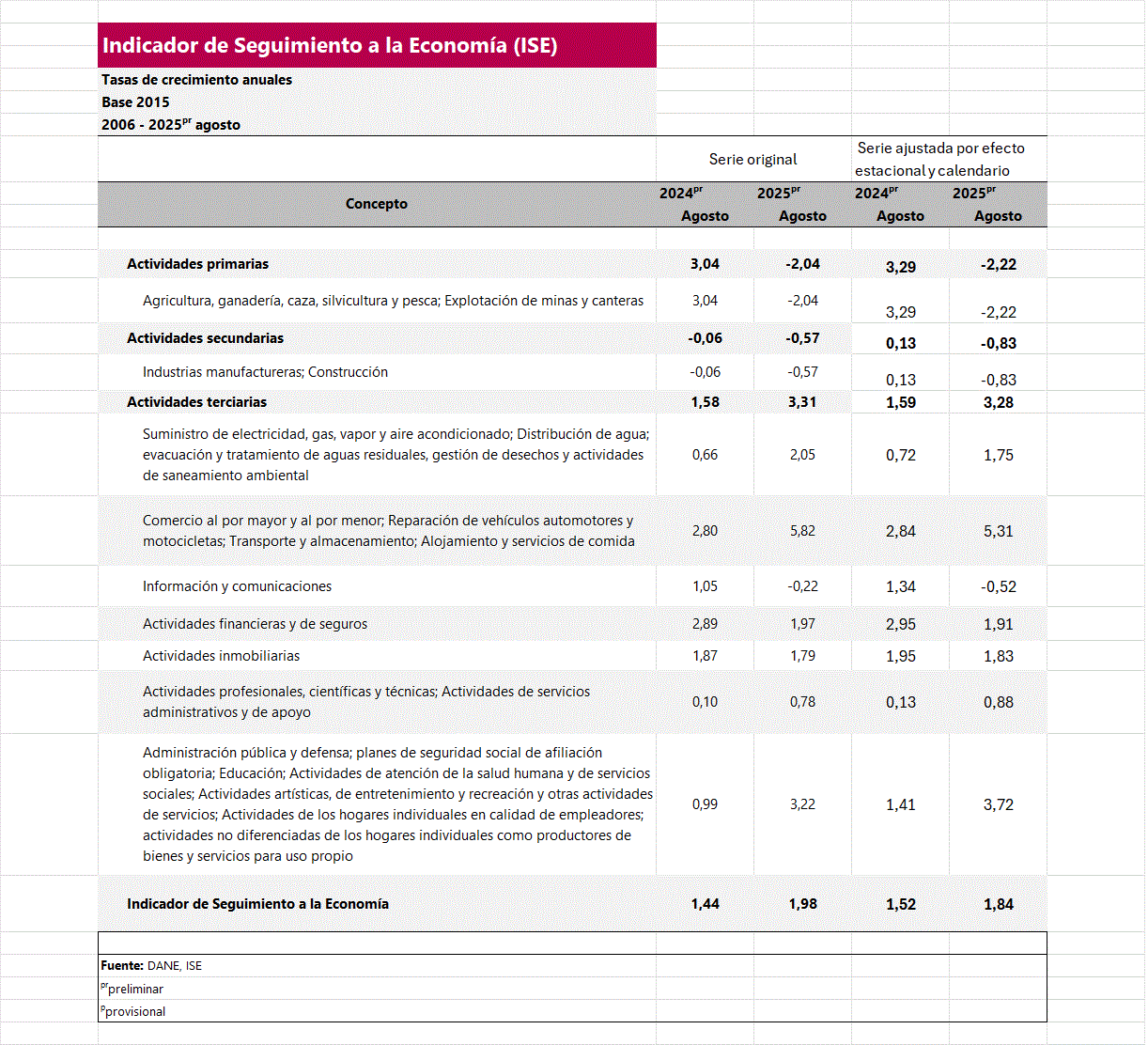 El Centro de Estudios Económicos de la Asociación Nacional de Instituciones Financieras afirma el liderazgo del comercio es por la adquisición de los hogares de bienes entre estos equipos de informática, alimentos y electrodomésticos. El desempeño del transporte aéreo el aumento de pasajeros internacionales. En cuanto a la administración pública, el pago retroactivo a entidades de la rama judicial, notariado y registro, destacan el gasto de la Registraduría Nacional del Estado Civil las elecciones de los Consejos de Juventud. Las artísticas el concierto de la agrupación Green Day de punk rock en Bogotá y la asistencia de 35.000 personas. Las apuestas ‘deportivas’ y juegos en línea continúan con aportar significativamente. El decrecimiento del sector segundario está en la construcción, la falta de inversión en edificaciones residenciales y civiles no compensa el agregado con la industria, la cual en la variación anual de agosto crecía el 0,4%, la fabricación de refinados de petróleo, químicos, además farmacéuticos y plaguicidas.