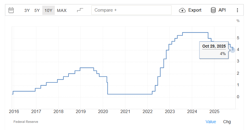 La Reserva Federal de los Estados Unidos ajustó la Tasa de Interés de Política Monetaria el 29 de octubre de 4,25% a 4,00%, la reducción de 25 puntos básicos financieros, en diciembre está previsto otro ajuste. El principal argumento de la decisión mayoritaria, el desempleo en agosto de 2024 el 4,00% y 2025 el 4,30%. En cuanto a las nóminas no agrícolas, el mercado laboral contrató 22.000 en agosto, antes de abril eran más de 100.000 trabajadores contratados cada mes. La inflación de septiembre está con el 3%, más el 0,6% comparada con el mismo mes de 2024, y hasta el momento no es el criterio de la reserva para establecer la Tasa de Interés. La economía estadounidense en el segundo trimestre creció 2,1%, en el 2024 en el mismo periodo crecía el 2,8%. Los bonos del tesoro a 10 años cotizaron sobre el 4,09% el 30 de octubre de 2025.