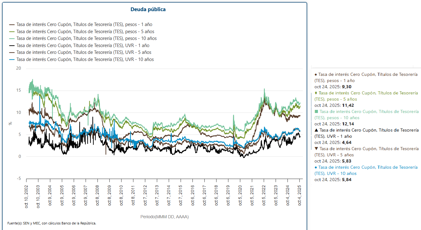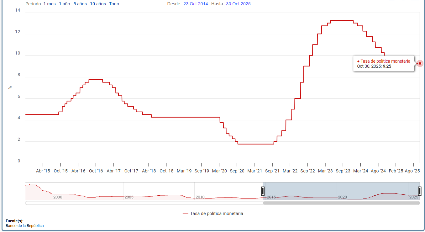 La Tasa de Interés de Política Monetaria en Colombia está con el 9,25%. La Encuesta Mensual de Expectativas de los Analistas Económicos predicen el pronunciamiento de la mayoría de la Junta Directiva, la ajustarían hasta abril de 2026 y según cómo esté el entorno, los elementos macroeconómicos de la decisión serían a la baja con ajustarla 9,00%. Las respuestas de los consultados, la inflación finalizaría el 2025 sobre el 5,20%, en septiembre del próximo año estaría sobre el 4,25%. La Tasa representativa del Mercado el precio de un dólar aproximadamente con $4.000. El desempleo entre el 8,95% y 9,35%. El crecimiento tendría tendencia expansiva de 2,5% y 2,7%; sin decrecer durante 2026. El déficit fiscal entre 7,00% y 6,70%.