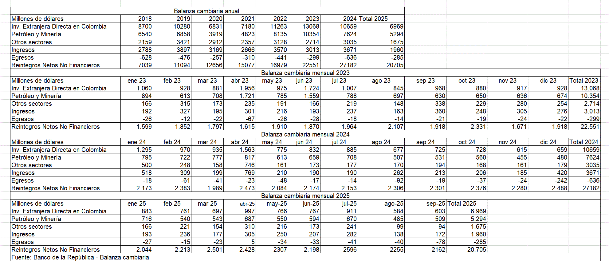 La balanza cambiaria mensual, la inversión extranjera registrada de septiembre 2024 con USD$725 millones y en el 2025 eran USD$603 millones, el país dejó de recibir -USD$123 millones. Petróleo y minería -USD$ 22 millones, el -4,2%. Otros sectores -USD$100 millones, el -51,6%. Los ingresos netos financieros de USD$2.301 millones a USD$2.162 millones, menos -USD$139 millones, el – 6,0%, entre esto como las divisas por turismo, servicios portuarios, seguros y reaseguros, marcas, patentes y regalías, servicios técnicos, servicios de transportes por tubería de petróleo y gas natural, gastos de permanencia de viajeros de negocios, gastos médicos y educativos, seguridad social, suscripciones y afiliaciones, arrendamientos operativo, publicidad comercial, servicios culturales, artísticos, y deportivos, pasajes, servicios de comunicación, comisiones no financieras, servicios diplomáticos, consulares,  entre otros.