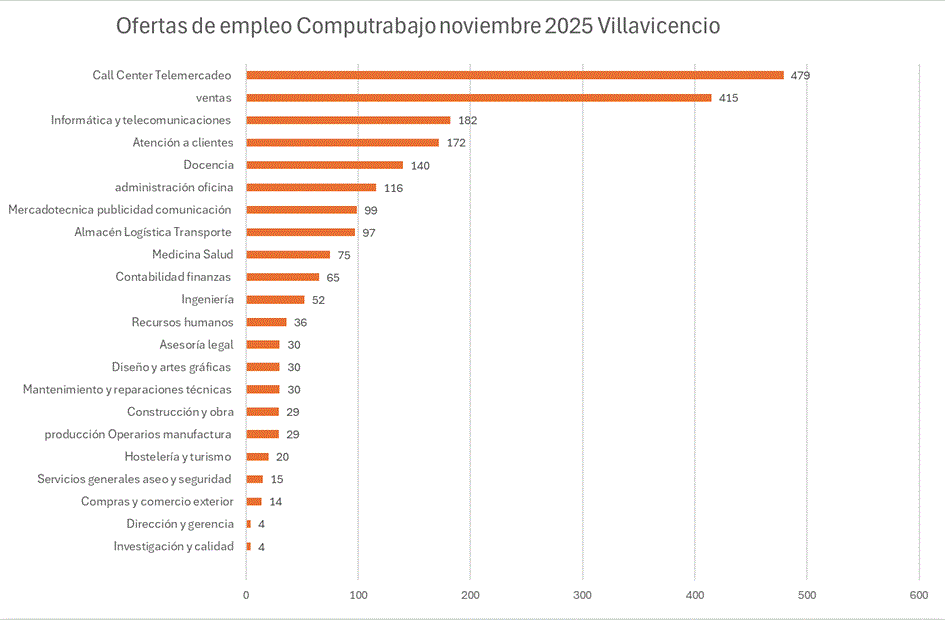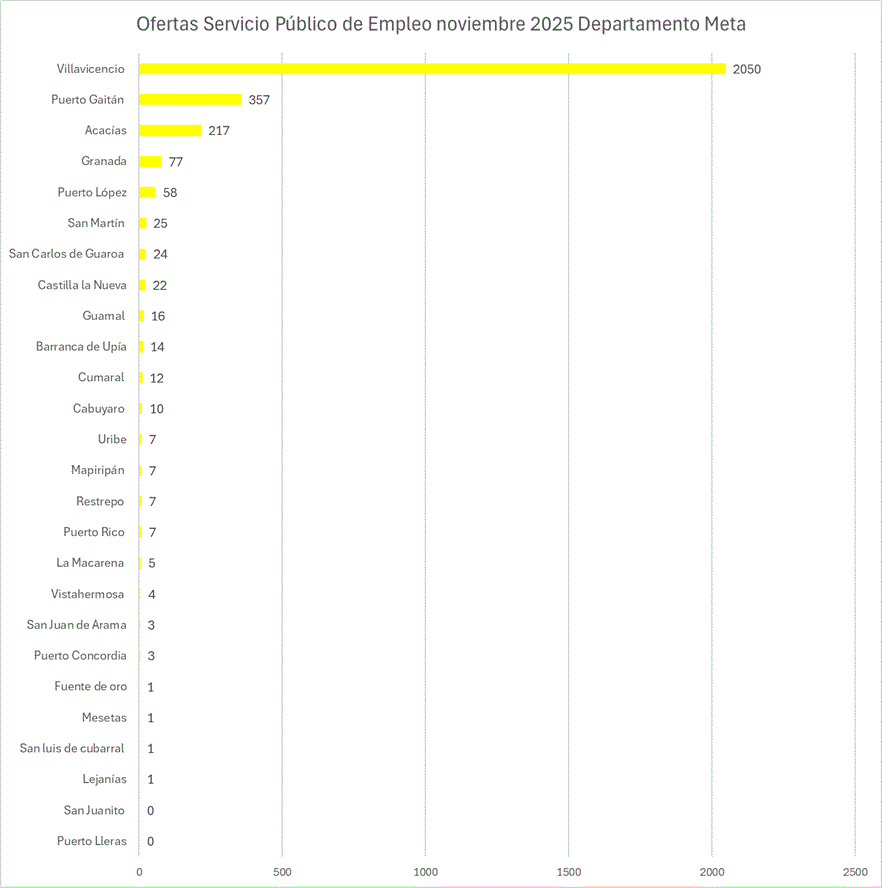 El mercado laboral de septiembre medido por el DANE, los desocupados en el municipio de Villavicencio son 17.898 y las vacantes promedio consultadas el 14 de noviembre 2.197, el 8% están disponibles para las personas en la desocupación de acuerdo con los requisitos u ocuparlas por rotación quienes cambian de trabajo.