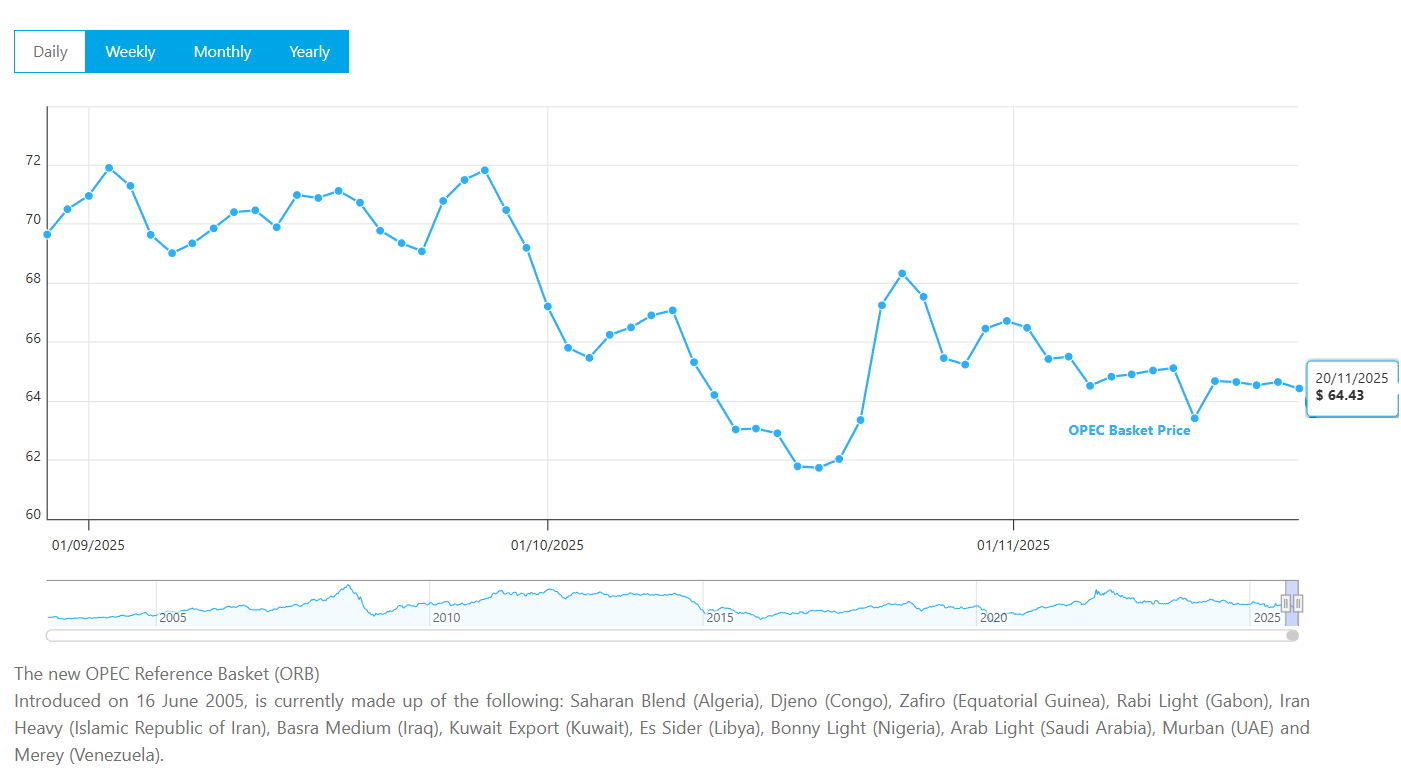La Organización de Países Exportadores de Petróleo OPEC estableció el 17 de noviembre el precio de un barril con USD$64.65. Los cuatro días estuvo sobre los USD$64. Los cambios de precio con tendencia lateral y levemente a la baja fueron de centavos, el día 20 de este mes con USD$64.43, sin establecerlo el viernes; hasta el jueves dejó de costar durante la semana USD$0.22 (veintidós centavos), varió negativamente el valor con menos -0,34%