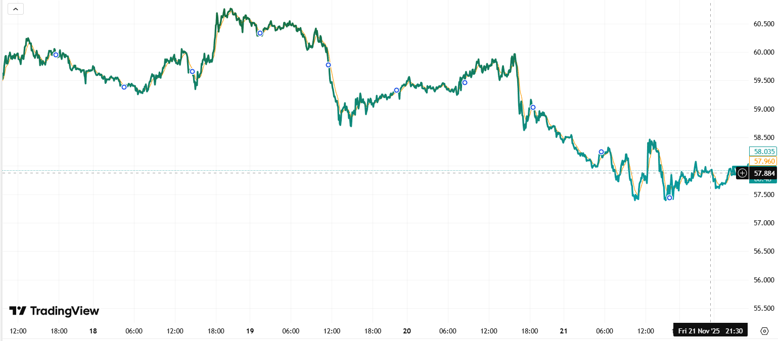 La desvalorización de un barril fue -4,25% la tercera semana de noviembre. Los posibles escenarios alcistas serían a más de USD$62 y bajistas sobre los USD$59.