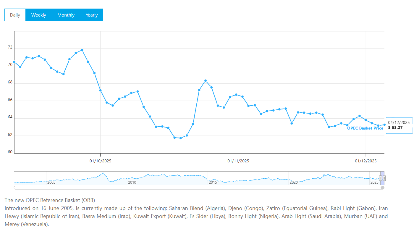 El precio establecido por la Organización de Países Exportadores de Petróleo OPEC, el lunes primero de diciembre USD$63.79, el martes USD$63.44, miércoles USD$63.17, el jueves último día fijado por la OPEC USD$63.27. Así el barril, la desvalorización fue de menos -0,82%, es decir dejó de costar durante la semana menos -USD$0.52. El 4 de noviembre costaba USD$65.43 en el transcurso del mes cambió con USD$2.16 hasta el 4 de diciembre cuando el costo fue de USD$63.27, la variación menos -3,41%.