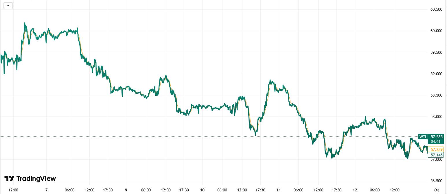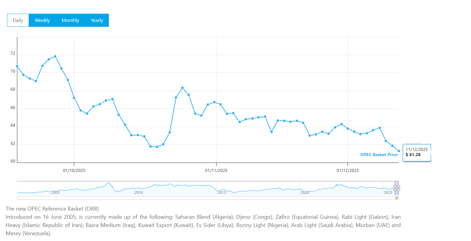 El Ministerio de Finanzas de Rusia reveló los ingresos por la producción de petróleo con 410 billones de rublos, aproximadamente USD$5.17 billones de dólares los cuales respaldan la economía de guerra contra Ucrania. El Kremlin además afirma exportar a India mientras Vladimir Putin visitó Nueva Delhi. Por lo anterior, la política exterior de Estados Unidos con imponer aranceles al 50%. En el contexto extractivo de Medio Oriente, en Iraq el campo West Qurna restableció la producción y aportaría con 460 mil barriles promedio día BPD, operado antes por Lukoil empresa rusia sancionada. La Agencia de Información Energética de los Estados Unidos calcula 13.6 millones BPD producidos durante el 2025, más 380 BPD en comparación con el año anterior. La detención de barcos tanqueros los cuales transportan petróleo desde Venezuela, como la embarcación Skipper, no fue determinante en la formación del precio durante la segunda semana de diciembre, causar presiones alcistas en las opciones de compra cotizadas según referencias internacionales, la posible irrupción de la producción del país caribeño con 900 mil BPD, en su mayoría exportados a China, país también abastecido por Irán. El próximo año, la Agencia Internacional de Energía espera el aumento del suministro mundial con más de 860 mil BPD.