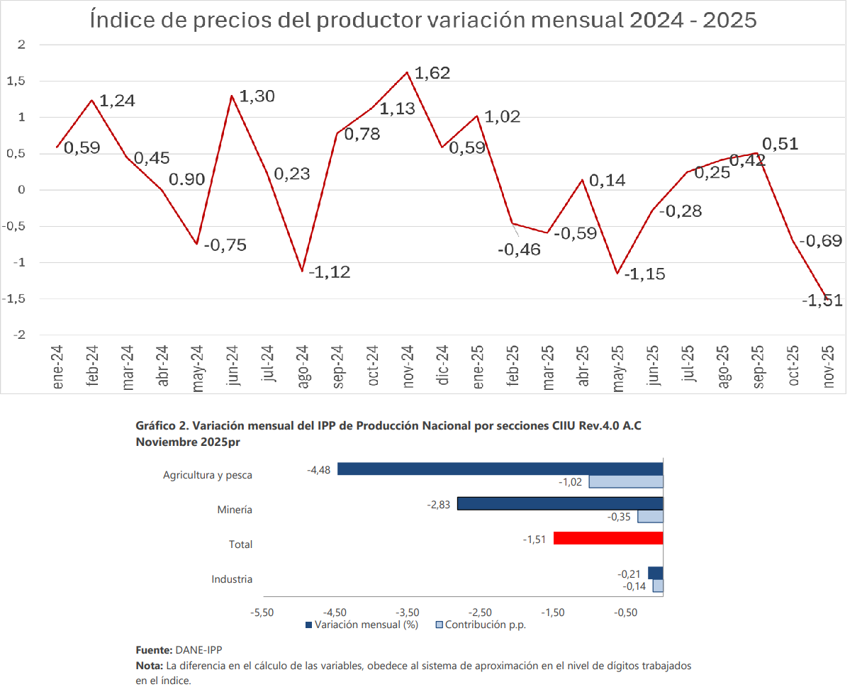 En la variación mensual a nivel nacional, los costos promedio de producir el año pasado eran de 1,62%, este año durante noviembre bajaron -1,51%. Desde entonces con tendencia a la baja, por lo anterior dejaron de incrementar el -3.13%. Según el Índice de Precios del Productor.