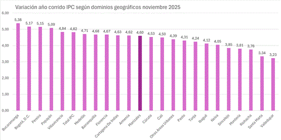 Durante el 2025 de enero a noviembre, las ciudades donde las presiones alcistas en los precios promedio están sobre el 5%, Popayán 5,09%, Pereira 5,15%, Bogotá 5,17% y Bucaramanga 5,38%. Catorce ‘dominios geográficos’ con otras áreas urbanas están sobre el 4%. En cinco los precios promedio variaron al alza a más de 3% como Valledupar con el 3,23%.