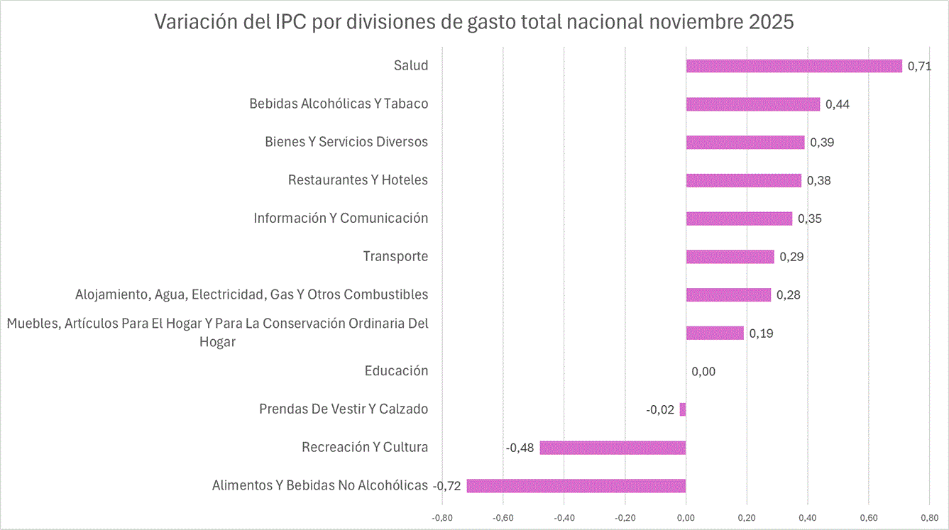 En la estructura de la canasta, los servicios con alzas mensuales de 0,22% durante noviembre 2025, los bienes durables 0,31%. Contrario en promedio durante el mes de noviembre disminuyeron de precio los semidurables menos -0,06% y durables -0,16%.