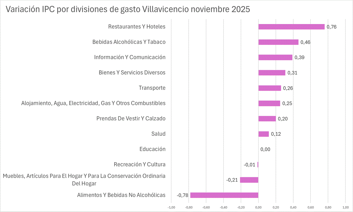 En Villavicencio la variación anual, la inflación en la ciudad es el 5,56% de noviembre y sobrepasó la media nacional. Alimentos con alzas anuales de 5,74%, transporte 5,33%, servicios públicos 5,29%; entre estos al agua bajó menos -6,9%, la ciudad desde mayo presenta cortes prolongados, provisión de agua por días a causa de daños y mantenimiento del acueducto. Los restaurantes y hoteles incrementaron los precios 10,02%, y desde septiembre sin presentar bajas significativas ante las dificultades en la vía Bogotá Villavicencio entre septiembre y noviembre por el cierre y paso limitado en la carretera.