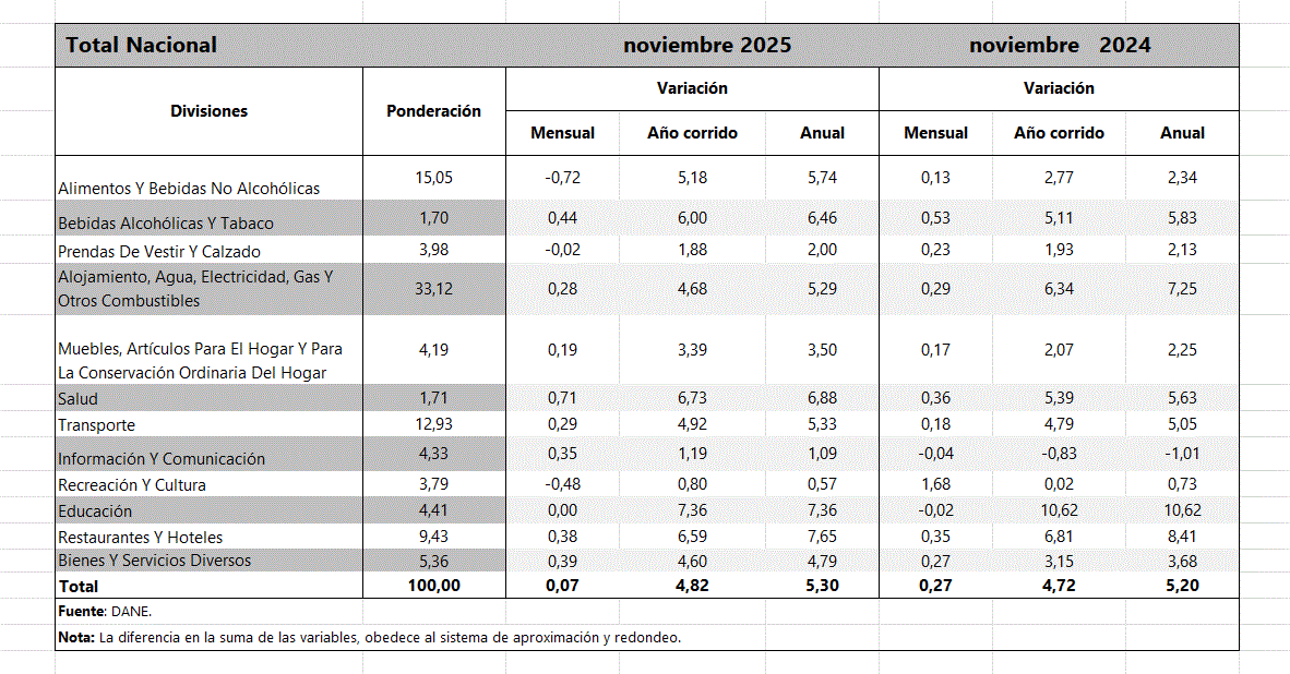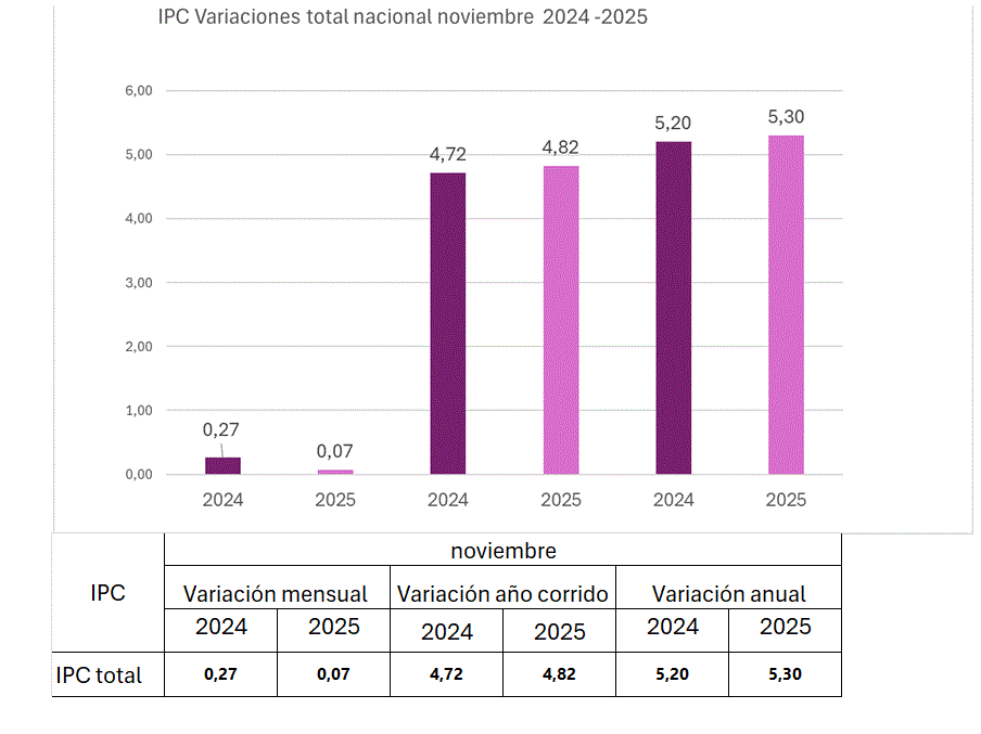 La inflación aumentó el 5,30%, de enero a noviembre de 2025 los precios promedio variaron al alza 4,82%, comparadas ambas variaciones con 2024, la diferencia de los incrementos es más 10%. En cuanto a la variación de precios promedio mensual con tendencia distinta dejaron de incrementar el 0,20%, el año pasado durante noviembre variaron 0,27% y está al 0,07%, según el Índice de Precios al Consumidor.