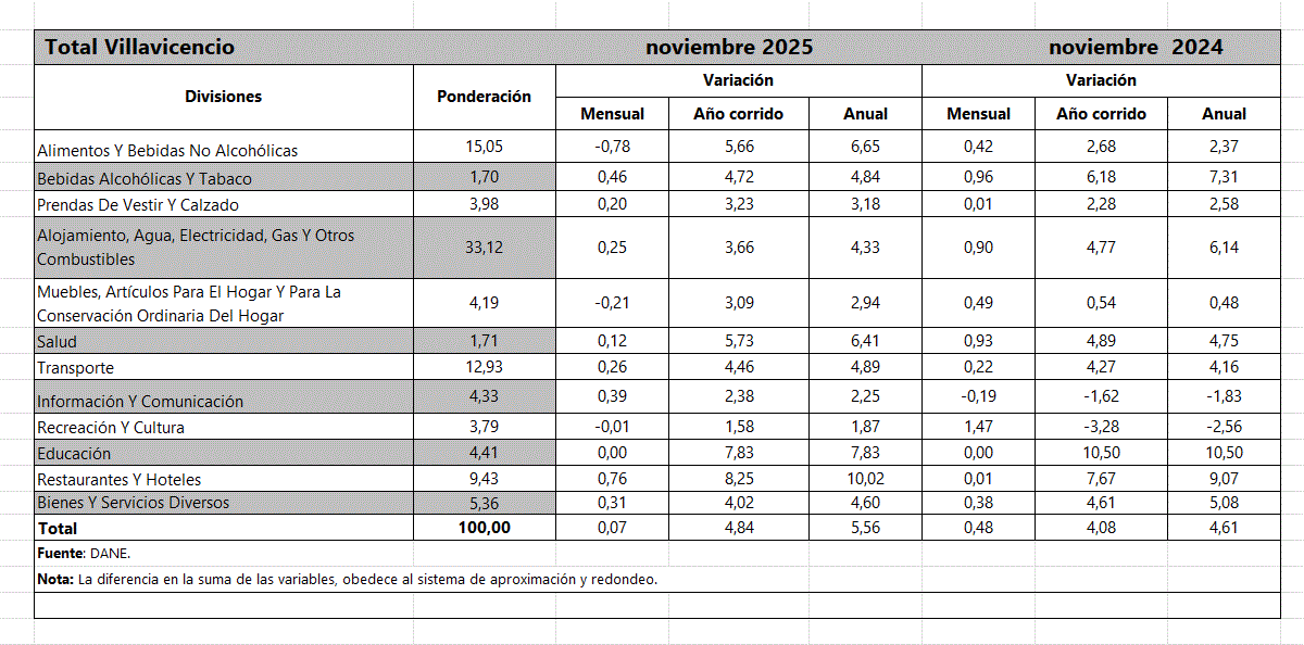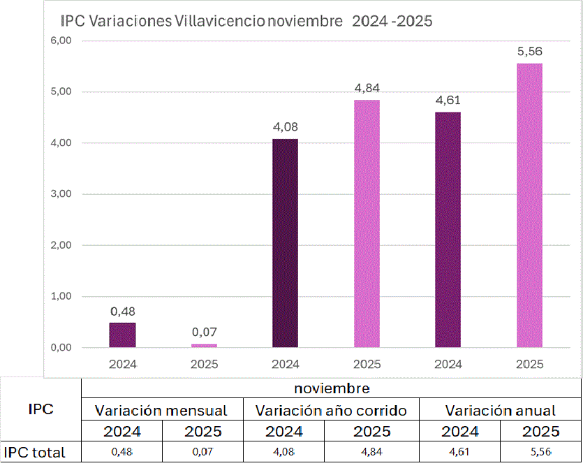 En Villavicencio la inflación varió 5,56% en el mes de noviembre con relación a los doce meces anteriores. De enero a noviembre de 2025 el 4,84% variaron al alza los gastos. En el mes, los incrementos de los precios 0,07%, mientras el año pasado eran 0,48%, dejaron de subir 0,41% en lo correspondiente con esta variación mensual.