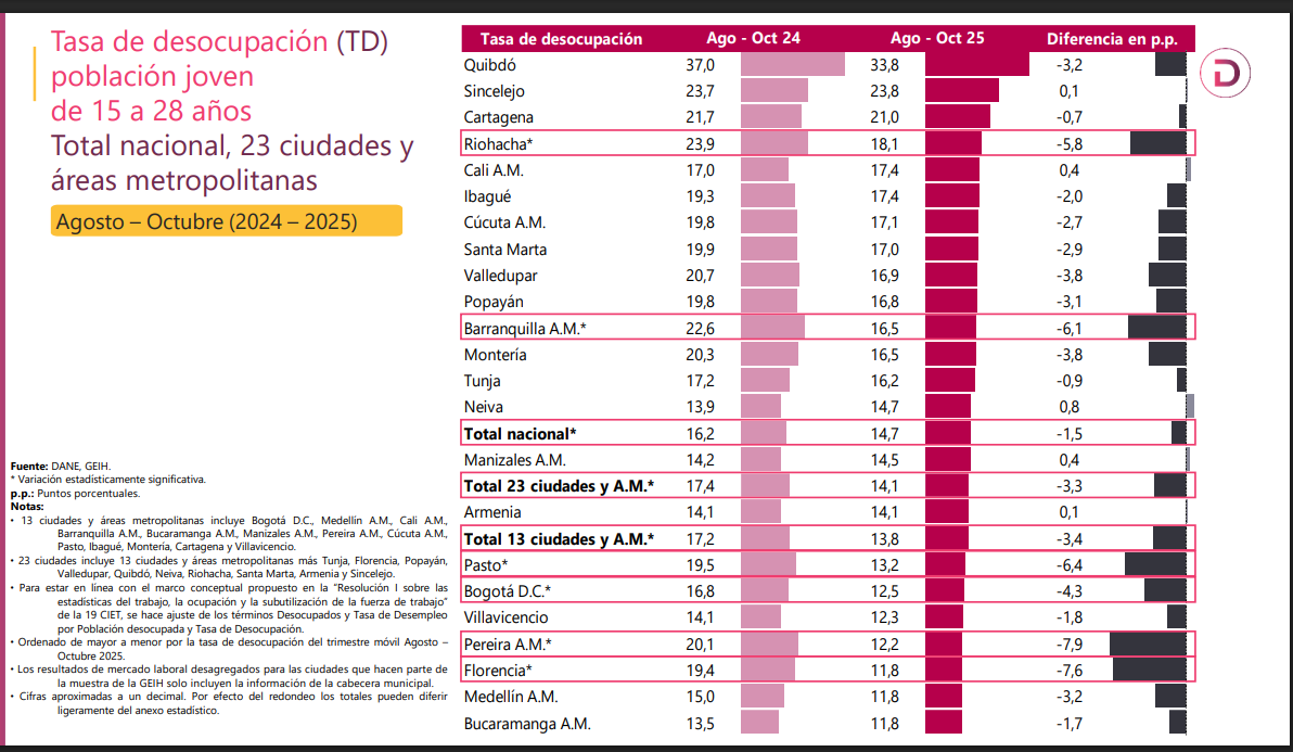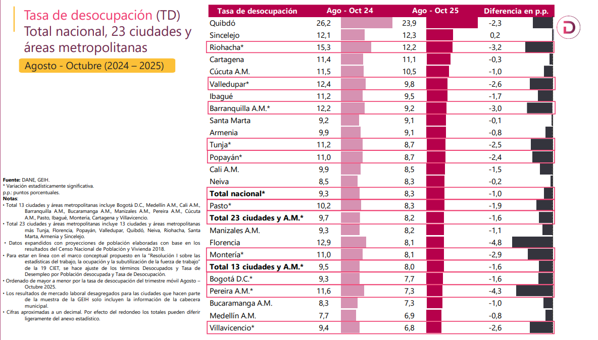 Las cifras absolutas trimestrales agosto octubre 2024 y 2025, los desocupados a nivel nacional de 2 millones 396 mil 614 (9,3%) a 2 millones 182 mil 521 (8,3%), menos -214 mil 093 (-1,0%). En las 23 ciudades con las áreas metropolitanas de 1 millón 173 mil 670 (9,7%) a 997 mil 922 (8,3%), menos -175 mil 748 (-1,0%). En cifras relativas en Quibdó la desocupación está con 23,9%, y disminuyó -2,3%. Ibagué 9,5%, menos 1,7%. En Neiva de 8,5% a 8,3%, menos -0,2%.