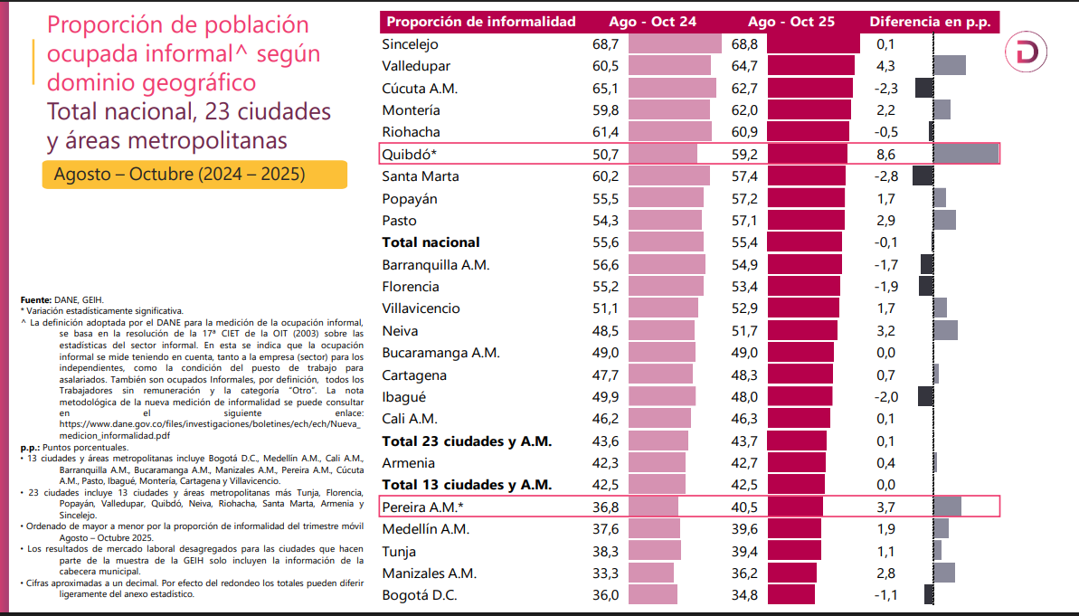 La informalidad en Colombia durante el trimestre agosto octubre 2024 y 2025 de 12 millones 975 mil 549 a 13 millones 325 mil 526, más 349 mil 976 según los anexos en cifras absolutas (ver imagen), distinta a la gráfica en términos relativos la cual muestra una reducción con pasar 55,6% a 55,4%, menos -0,1%. En las 23 ciudades con áreas metropolitanas de 5 millones 355 mil 522 (43,6%) a 5 millones 554 mil 461 (43,7%), más 198 mil 939 (0,1%). En Villavicencio los ocupados en esta condición de 125 mil 770 (51,1%) a 135 mil 092 (52,95), más 9 mil 323 (1,7%).