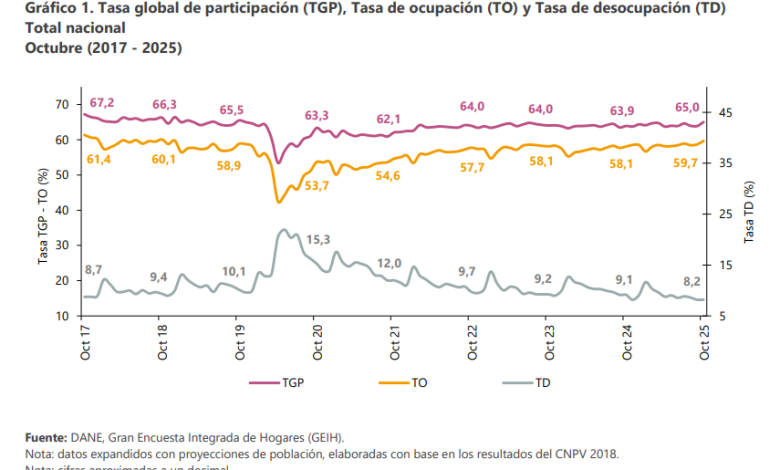 En Colombia, la desocupación disminuyó de 9,1% a 8,2%, con el 0,9%. La ocupación comparada con octubre de 2024 aumentó 1,6%. La población en edad de trabajar e integrante de la “fuerza de trabajo”, la “Tasa Global de Participación” aumentó más 1,1% en todo el país según las gráficas de la entidad estadística.