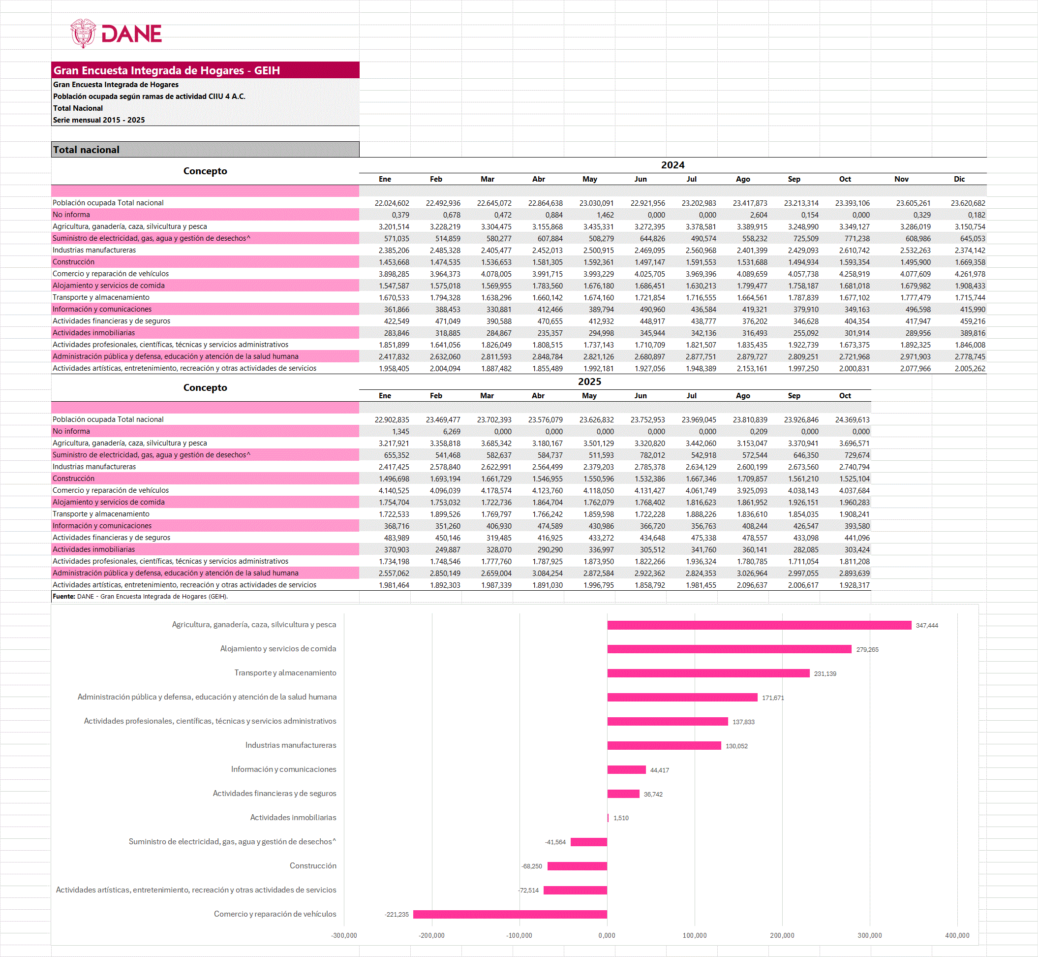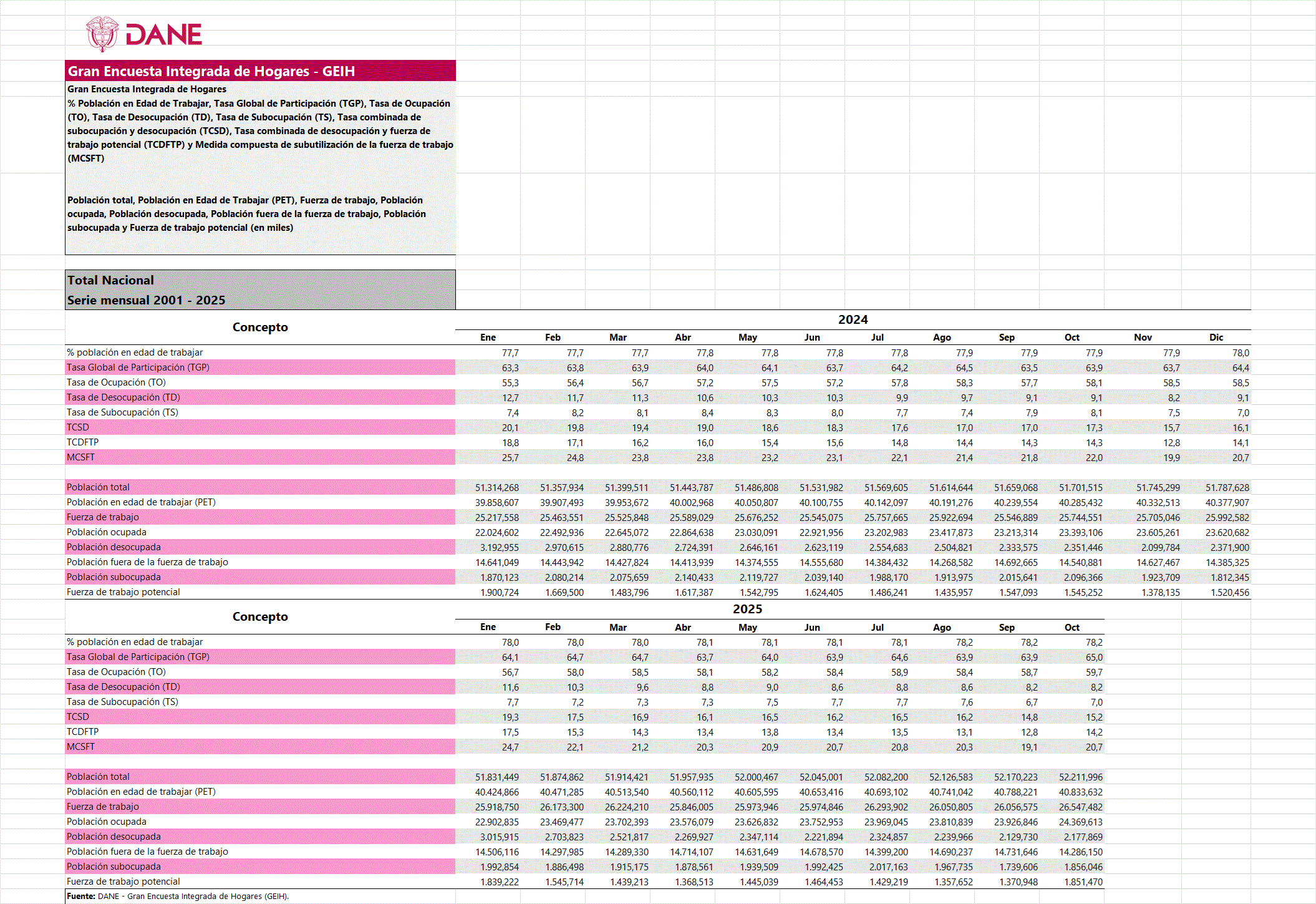 La población total en Colombia según proyecciones del DANE de 51 millones 701 mil 515 octubre 2024 a 52 millones 211 mil 996 octubre 2025, más 510 mil 481 en la medición de los periodos interanuales. La población en edad de trabajar de 40 millones 285 mil 432 a 40 millones 833 mil 632, más 548 mil 200. La fuerza de trabajo de 25 millones 744 mil 551 a 26 millones 547 mil 482, más 802 mil 931, entre estos los ocupados de 23 millones 393 mil 106 a 24 millones 369 mil 613, más 976 mil 508. Los desocupados de 2 millones 351 mil 446 a 2 millones 117 mil 869, menos -173 mil 577.