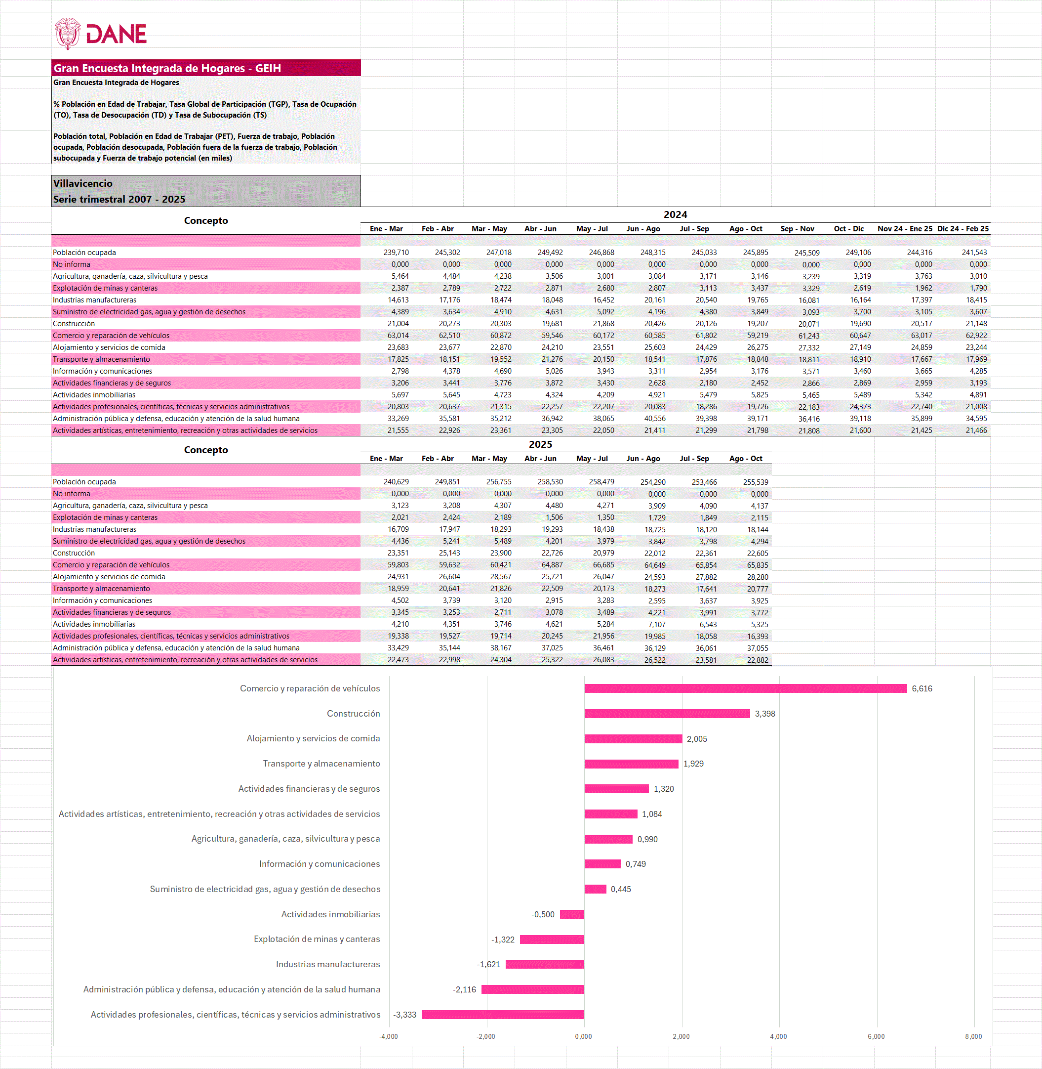 En el mercado laboral a nivel nacional, la agricultura entre otras, el alojamiento como hoteles y servicios de comida, con el transporte y almacenamiento, las principales actividades con aporte significativo y ocupar más comparativamente con octubre de 2024. En Villavicencio, el comercio y reparación de vehículos, la construcción, y también alojamiento en hoteles y restaurante crearon puestos de trabajo según las dinámicas económicas de la ciudad. Sin identificarse algún factor negativo por el cierre vial y pasos intermitentes en el kilómetro 18 de la vía Bogotá a Villavicencio con afectar la ocupación.