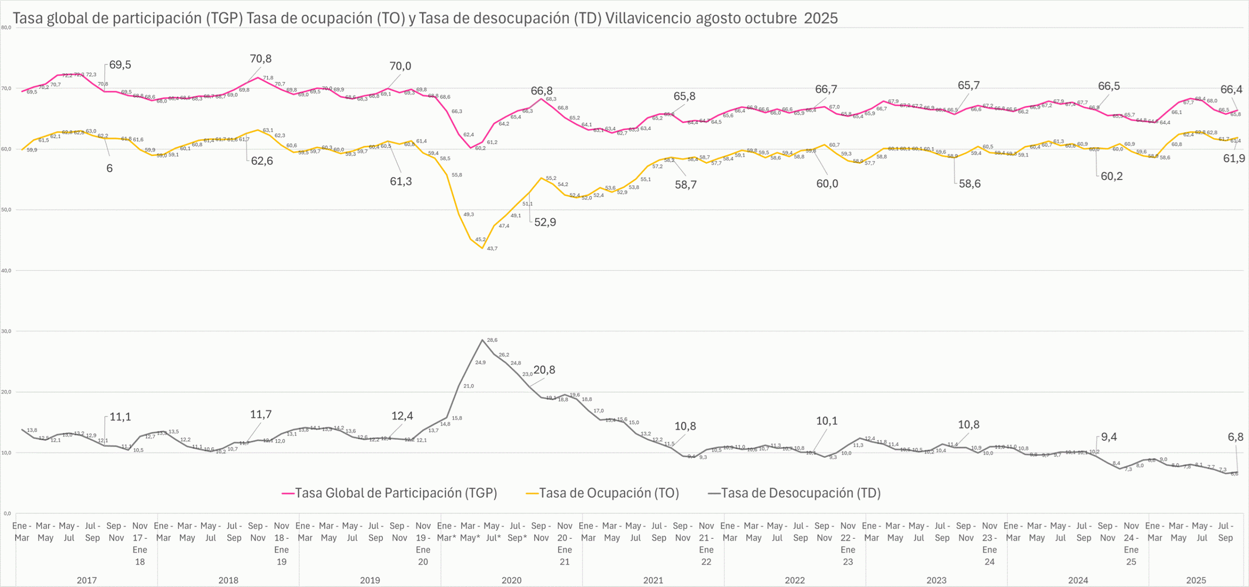 La desocupación en Villavicencio de 9,4% en agosto octubre 2024 a 6,8% agosto octubre 2025, menos el -2,6%. La ocupación aumento 1,7%. Y la población en edad de trabajar e integrante de la fuerza de trabajo de 66,5% a 66,4%, menos 0,1%.