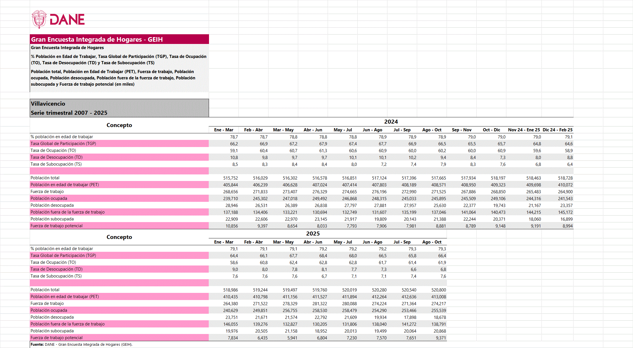 Según proyecciones del DANE el trimestre agosto octubre de 2024 y 2025, la población total en la Capital del Meta de 517 mil 665 a 520 mil 800, aumentó más 3 mil 135. En edad de trabajar de 408 mil 571 a 413 mil 008, más 4 mil 437. La fuerza de trabajo de 271 mil 525 a 274 mil 217, más 2 mil 692, entre estos los ocupados de 245 mil 895 a 255 mil 539, más 9 mil 644. Los desocupados de 25 mil 630 a 18 mil 678, menos -6 mil 952.