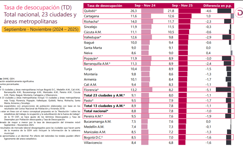 En el trimestre septiembre noviembre de 2025 la desocupación en Colombia 7,8% y Villavicencio 6,8% Actualidad Sistema de Noticias Ondas