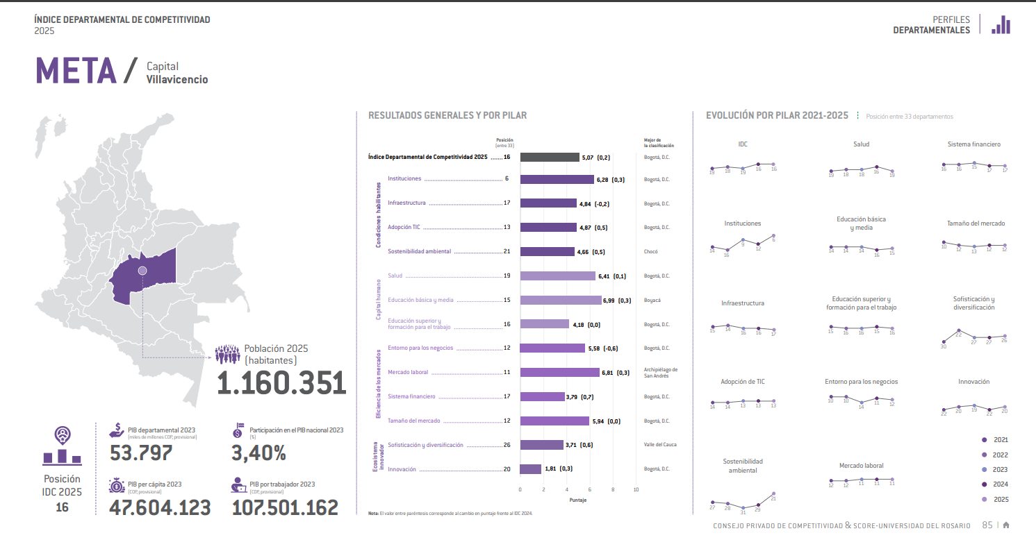 El Índice de Competitividad Departamental observa el desempeño entre otros aspectos de la infraestructura, la sostenibilidad ambiental, el mercado laboral, la innovación, así la comprensión de cuáles retos tiene frente a los demás. El Meta tanto en el 2024 y 2025 ocupa el lugar 16 entre los 32 departamentos con un Distrito, con más factores competitivos Bogotá D.C, la Capital del país está de primer lugar por contar con más condiciones competitivas, el municipio de Vichada está en el último puesto del ranking.