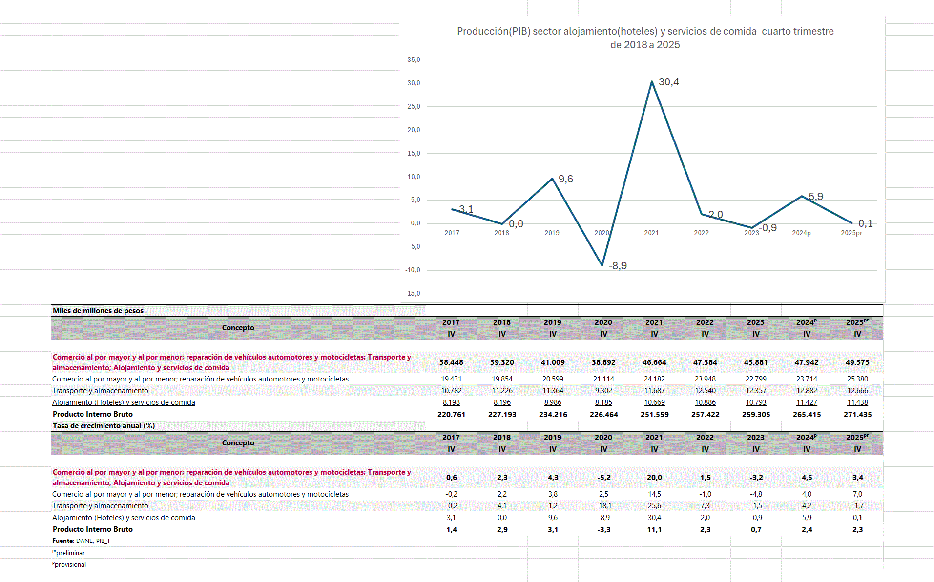 El PIB del sector, la producción durante el cuarto trimestre de 2025, el aporte es de 11 billones 438 mil millones de pesos, creció el 0,1%. En el 2019 y 2024 creció más mientras era estable el desempeño de la economía, distinto 2021 por dinámicas atípicas, la reactivación después de la pandemia, en el 2020 decreció menos -8,9%; aun así el sector aportó con 8 billones 185 mil millones de pesos según los estimativos.