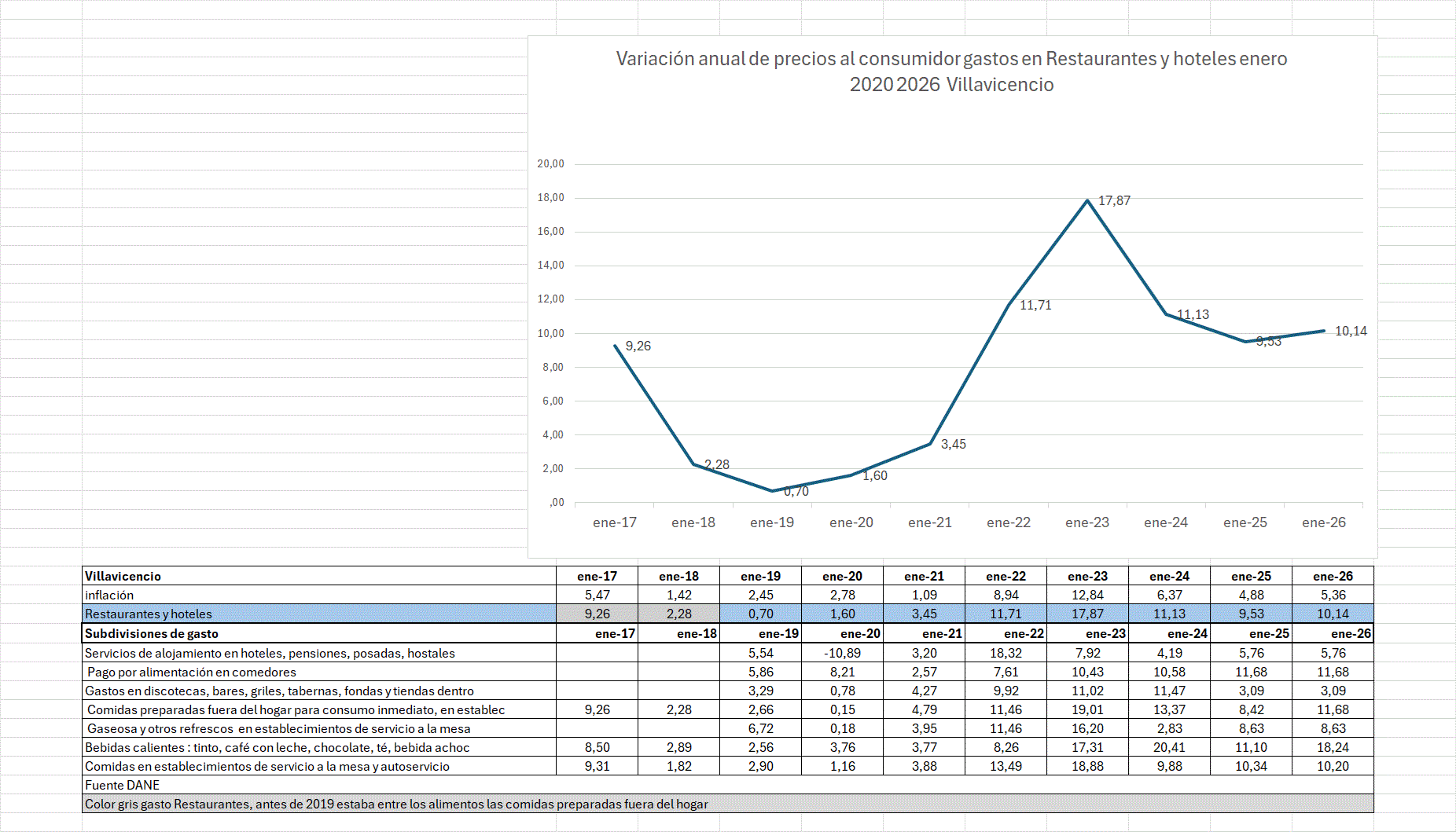 En Villavicencio, los precios de los restaurantes y hoteles la variación anual desde enero 2021 hasta enero 2026 con alzas sobre el 9,50% como lo fue 2025. En el 2018 aunque estos gastos promedio eran parte de alimentos incrementaban más 9,26%. En el 2023 variaron con el 17,8% y en el 2026 aproximadamente 10,1% con tendencia alcista.