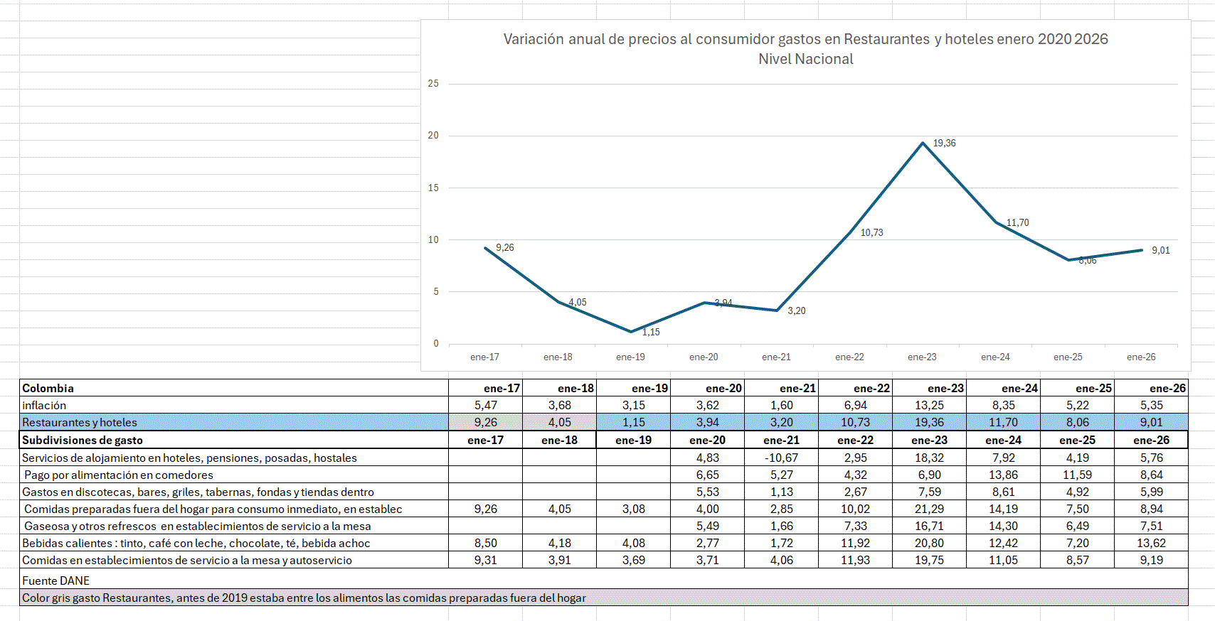 En el Índice de Precios al Consumidor, los restaurantes y hoteles estaban definidos entre la alimentación, antes de 2018 variaba con las comidas preparadas fuera del hogar, tenía en cuenta bebidas calientes y establecimientos de servicio a la mesa. En el grupo de subgastos a partir de enero 2020 y por los cambios de la Encuesta Nacional de Presupuesto de los Hogares DANE 2017, hay otras categorías. Los restaurantes y hoteles en la anualidad con alzas de 10,7% enero 2022, y más 19,3% enero 2023, cuando más subieron de precio. Durante la pandemia y según la variación anual de enero 2020 a 2021 no variaron negativamente a excepción de los hoteles.