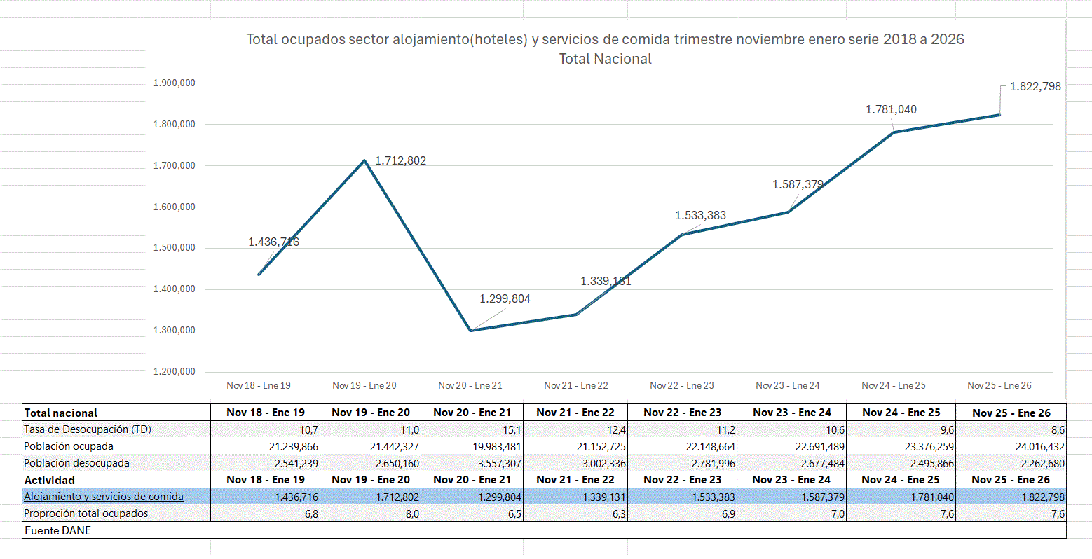 La ocupación a nivel nacional en el trimestre noviembre 2018 enero 2019, según el DANE, los ocupados en el sector 1’436.716 quienes trabajan en hoteles y restaurantes, durante el trimestre noviembre 2025 enero 2026 la ocupación 1’822.798, y desde entonces el sector ocupa más 386.082 a nivel nacional.