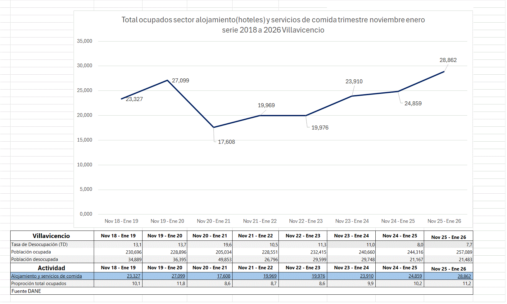 En Villavicencio con tendencia similar el mercado laboral como a nivel nacional, el sector ocupaba con 23.327 en el trimestre noviembre 2018 enero 2019, en la medición de noviembre 2025 enero 2026 trabajan 28.862 en restaurantes y hoteles, más 5.535 creció la ocupación.