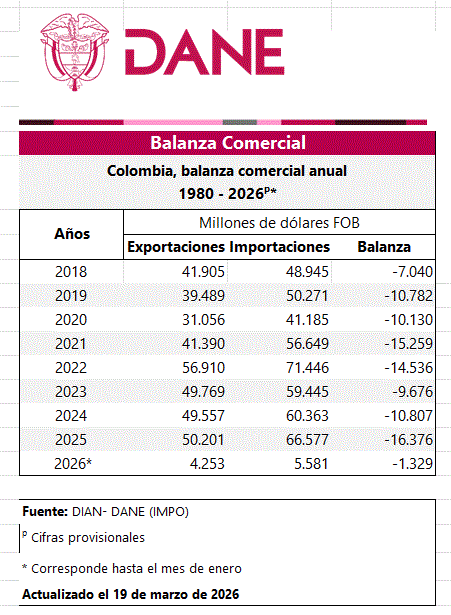 El déficit de la balanza comercial en Colombia fue de USD$16.376 millones y el superávit del Departamento USD$388 millones en el 2025