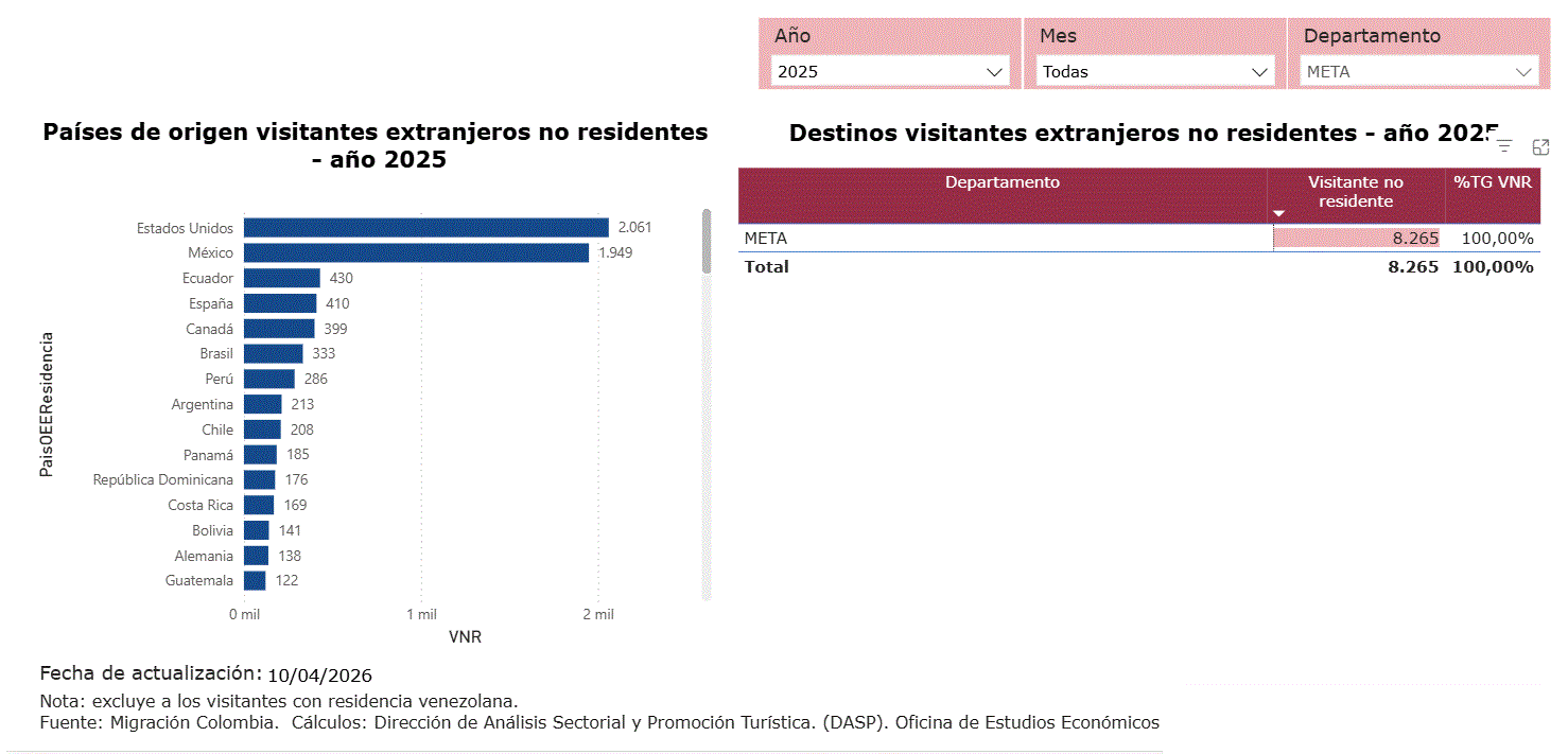 En Colombia los turistas durante el 2024, la sumatoria de los visitantes extranjeros no residentes 4’272.016 y en el 2025 con 4‘474.089, más 202.073, el 4,73%. Las ciudades con aeropuertos internacionales reciben más turistas. La participación a nivel nacional de quienes visitan el Departamento Meta, el 0,18% y significan 8.265. Bogotá el 35,3%, Antioquía 26,5%, Bolívar 18,9%, Tolima 0,23%, Amazonas 0,18%, y Córdoba 0,16%.