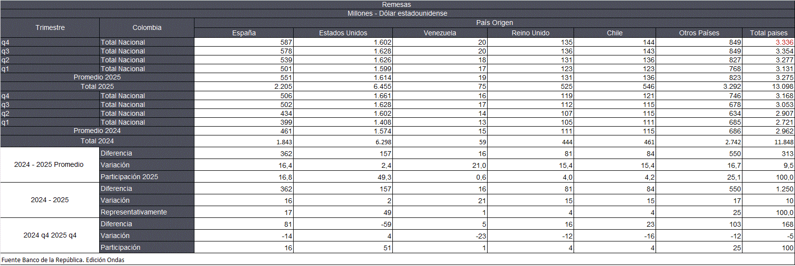 Las remesas recibidas en el 2025, según origen el promedio USD$551 millones de España según la conversión de la divisa y participa con el 16,8%. Estados Unidos USD$1 millón 614 mil, participan con el 49,3%. Venezuela USD$19 millones, el 0,6%. Reino Unido USD$131 millones, el 4,0%. Chile USD$136 millones, el 4,3%. Otros países USD$823 millones, el 25,1%.