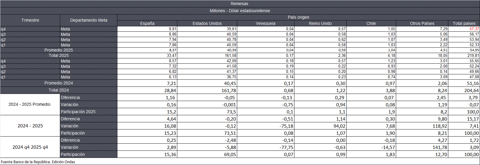 El Departamento recibió el promedio de USD$54 millones 95 mil, el año anterior USD$51 millones 16 mil durante el 2024, más USD$3 millones 79 mil, aumentaron el 3,79%. En el cuarto trimestre de 2025 con USD$57 millones 37 mil, la participación de los ingresos por concepto de remesas, el 15,2% son enviadas desde España. El 73,5% de Estados Unidos. El 0,1% de Venezuela. El 1,1% de Reino Unido. El 1,9% de Chile. El 8,2% de otros países.