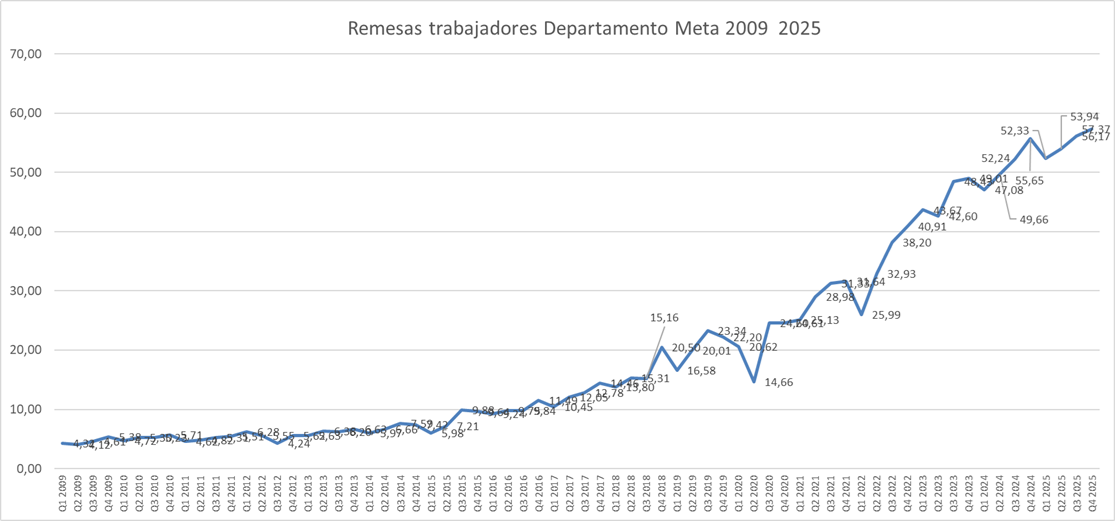 Las gráficas Colombia y Departamento Meta muestran cada año más remesas recibidas. El gasto de los hogares y personas receptoras aporta a las actividades comerciales. La producción tiene el impulso de los ingresos enviados de los connacionales extranjeros. Por lo anterior, la gestión financiera ante la volatilidad de las divisas. Las cuestiones sociales de las migraciones en los mercados laborales extranjeros y motivos de los movimientos migratorios.