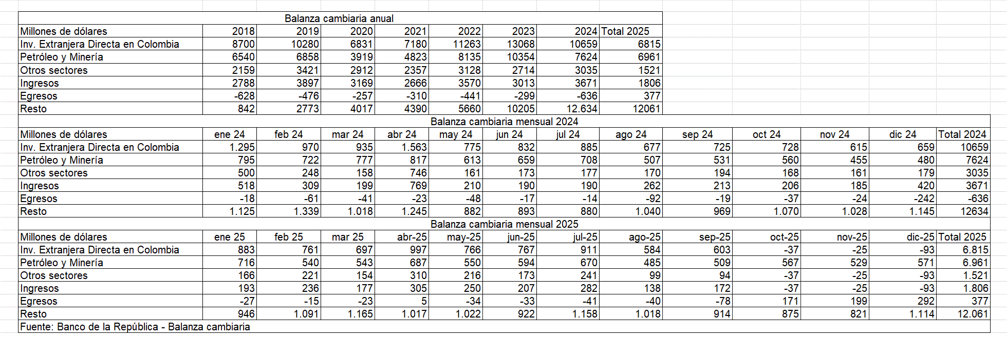 La divisa varía próxima con el precio fundamental de $3.600 registrado desde enero. La inversión extranjera acumulada para el año 2025 fue de USD$6.815 millones en Colombia